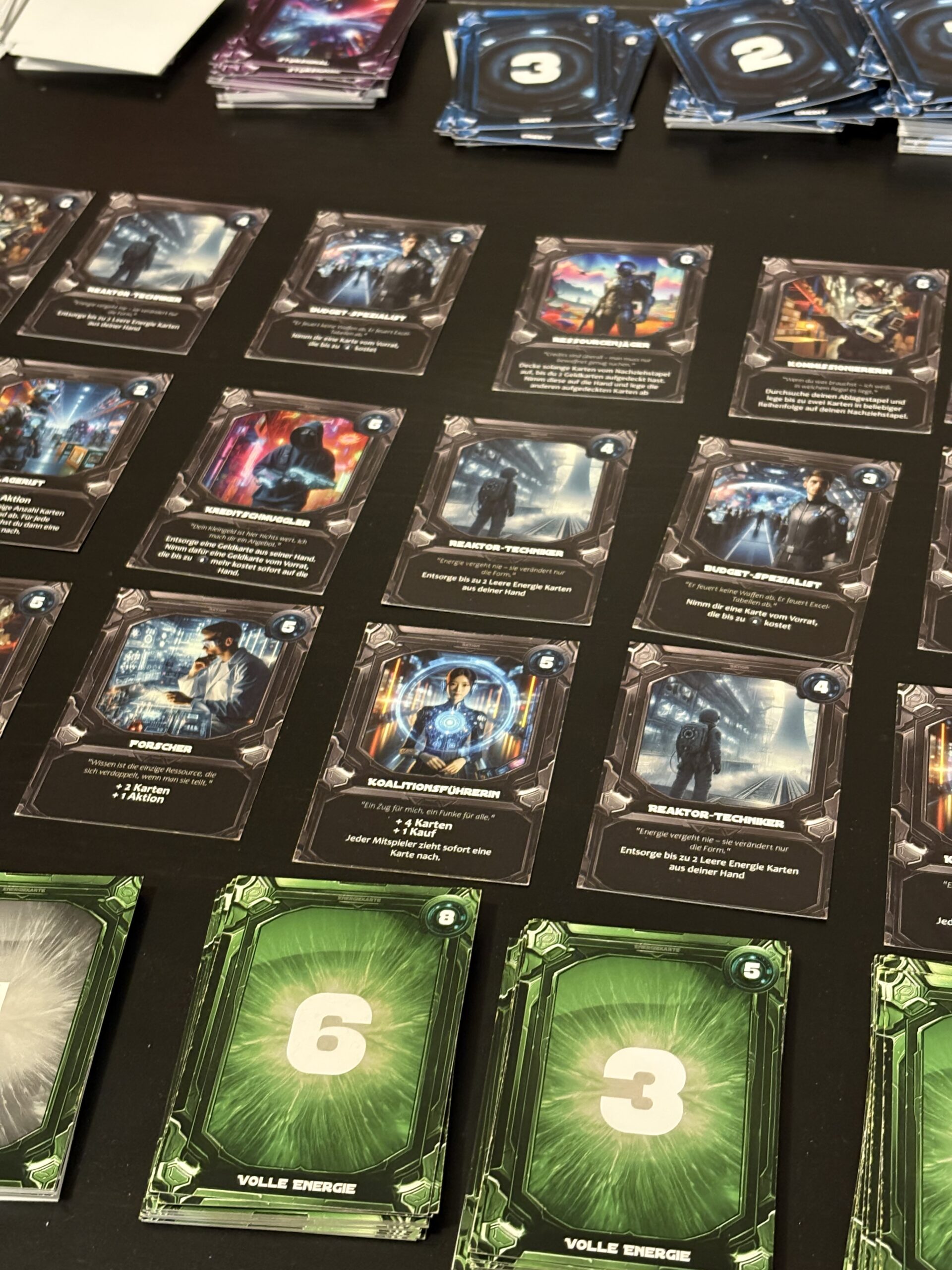 Inzwischen wurden viele kleine Stellschrauben beim Balancing justiert und entscheidende Verbesserungen vorgenommen. Die Version 2.0 geht nun in den Druck und präsentiert sich deutlich professioneller: Black-Core-Papier, abgerundete Ecken, gestaltete Rückseiten sowie eine hochwertige Veredelung sorgen für langlebige, perfekt spielbare Karten.
